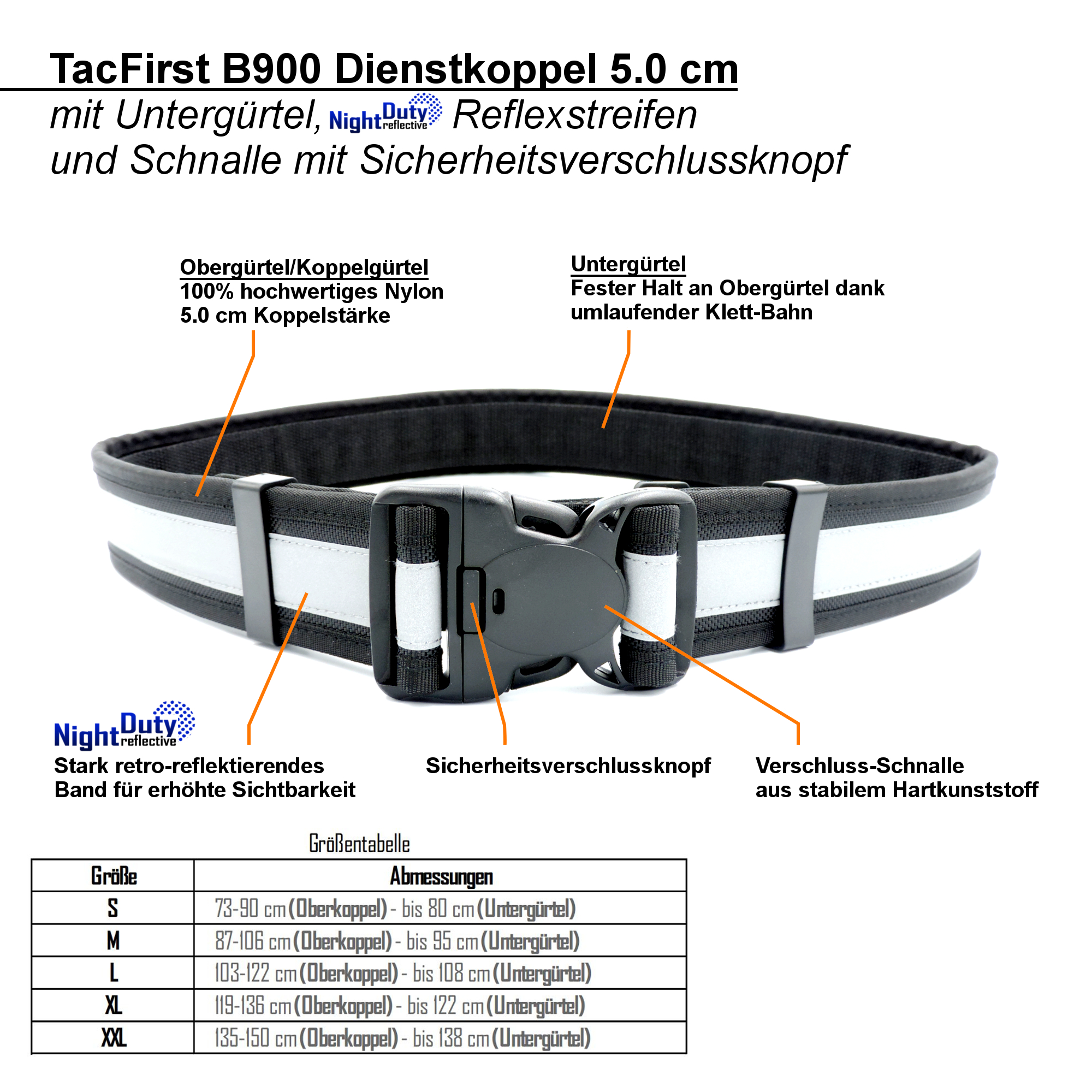 Damit Sie nicht versehentlich den Gürtel verlieren oder Ihnen der Gürtel im Handgemenge abgenommen wird, besitzt der Gürtel eine Sicherheitsschalle, welche mit beiden Händen geöffnet werden muss. Die Systemkoppel B900 ist im Bereich von 5 cm größenverstellbar und kann somit Ihren persönlichen Bedürfnissen angepasst werden.